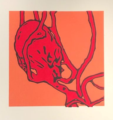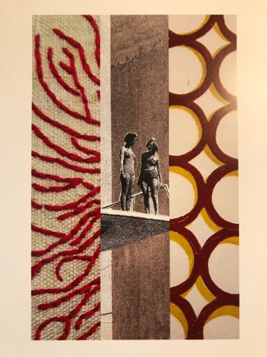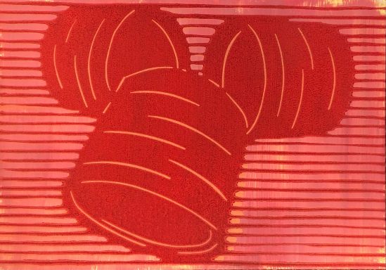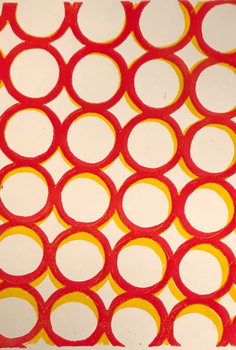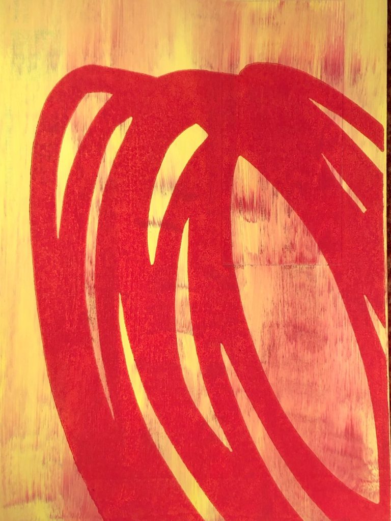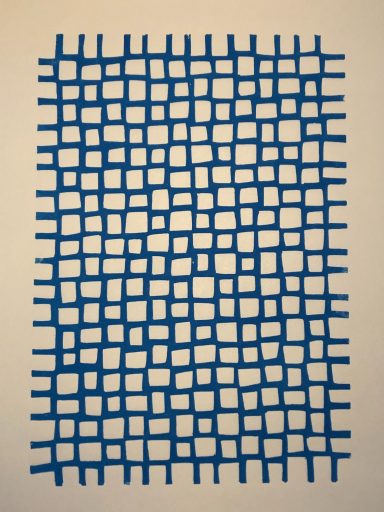 Die meist abstrakten Arbeiten handeln von Erinnerungen an Menschen, Momente, Räume. Mal wohliges Gefühl, mal Ahnung von etwas Verborgenem. Ich arbeite dabei mit den Mitteln des Linoldrucks und überdrucke auch gerne mit Gouache übermalte Flyer, Briefumschläge und Programmhefte.