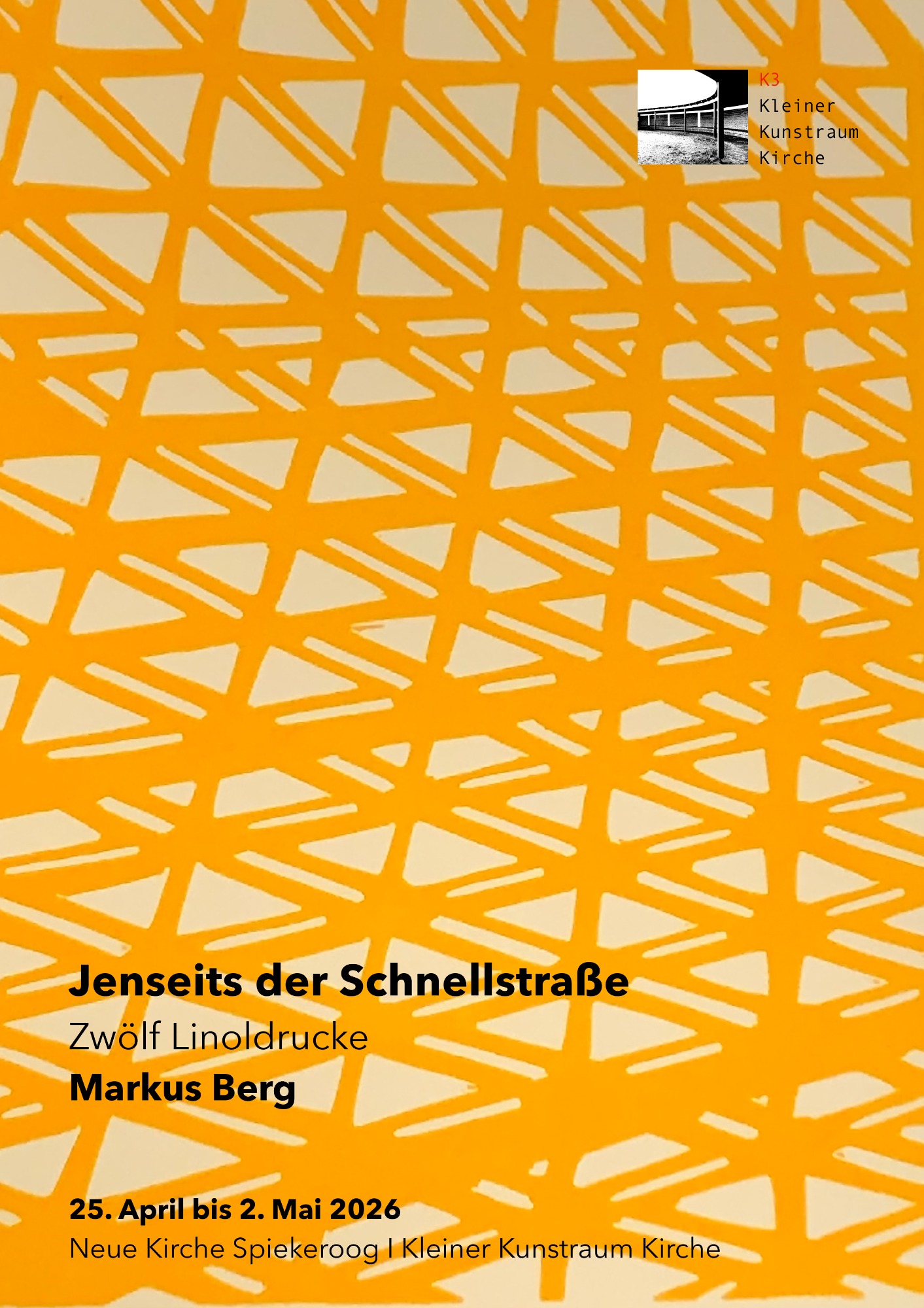 25. April bis 2. Mai 2026: Jenseits der Schnellstraße / Zwölf Linoldrucke, Kleiner Kunstraum Kirche, Neue evangelische Kirche, Spiekeroog (Das Plakatmotiv gibt es unten in der Galerie)
